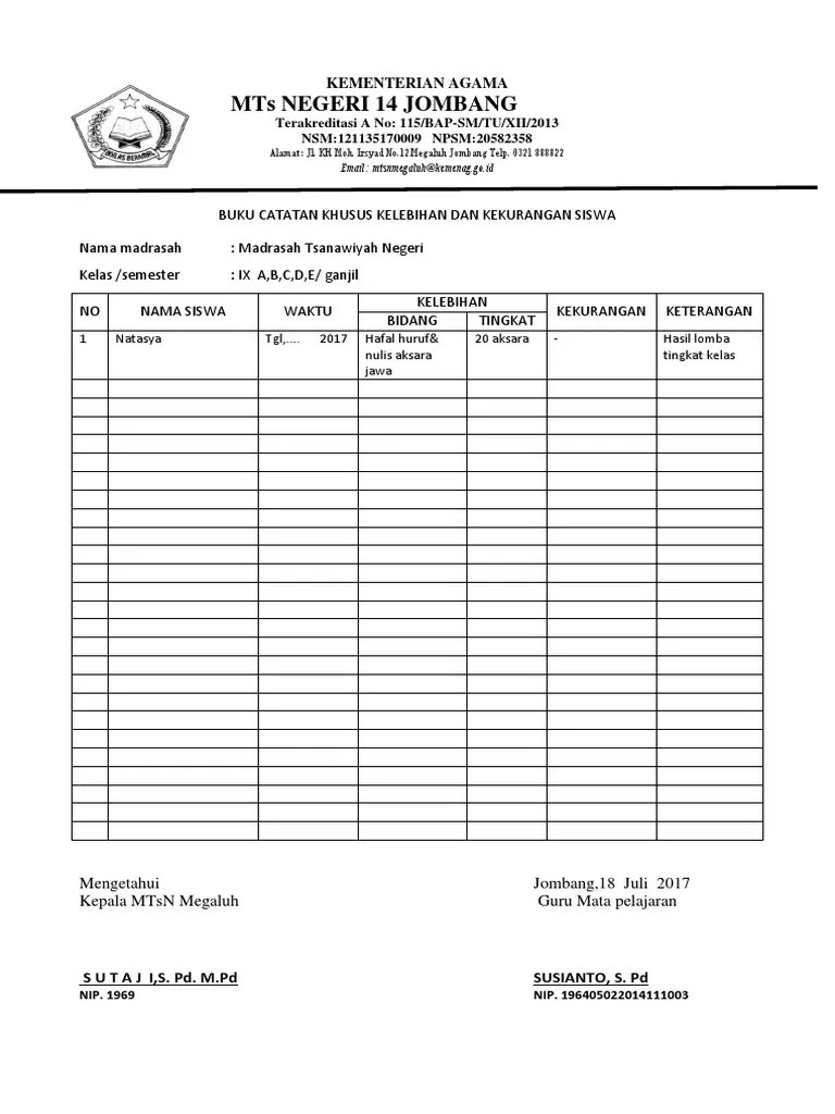 Contoh buku catatan perkembangan siswa.