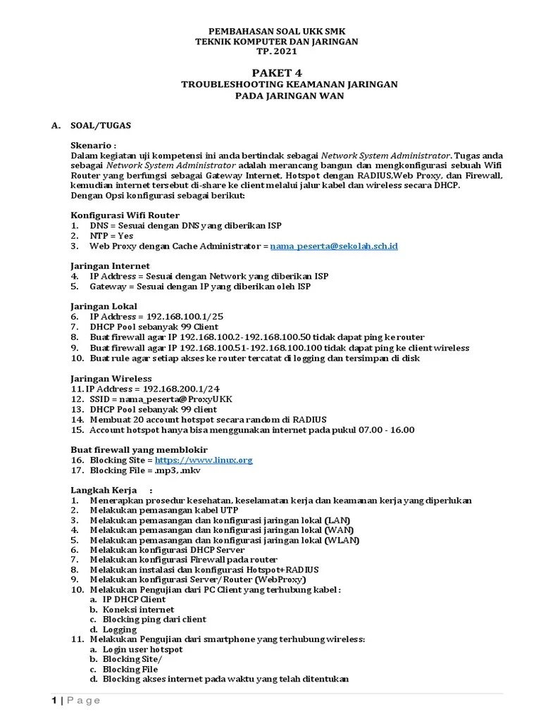 Soal ukk smk tkj 2020/2021. Soal ukk tkj paket 4 tahun 2021. Soal ukk perhotelan tahun 2021 Ukk sebentar lagi bagi kelas xii smk . Soal ukk akuntansi paket 1, 2, 3, 4 tahun 2021. Soal ukk dapat berbentuk penugasan atau bentuk lain yang dinilai secara individual untuk membuat suatu produk sesuai tuntutan standar . Teknik komputer dan jaringan (tkj). Artikel sedang dalam proses pembuatan. Gambar berikut ini adalah topologi paket 4, yang mana kita akan menggunakan mikrotik sebagai router untuk menghubungkan jaringan lan . Pembahasan ujikom 2020 paket 4. Pelaksanaan ukk di mulai pada tanggal 07 april 2021. Pembahasan soal uji kompetensi keahlian (ukk). Pembahasan soal ujian kompetensi keahlian teknik komputer dan jaringan (ukk tkj) smk tp.