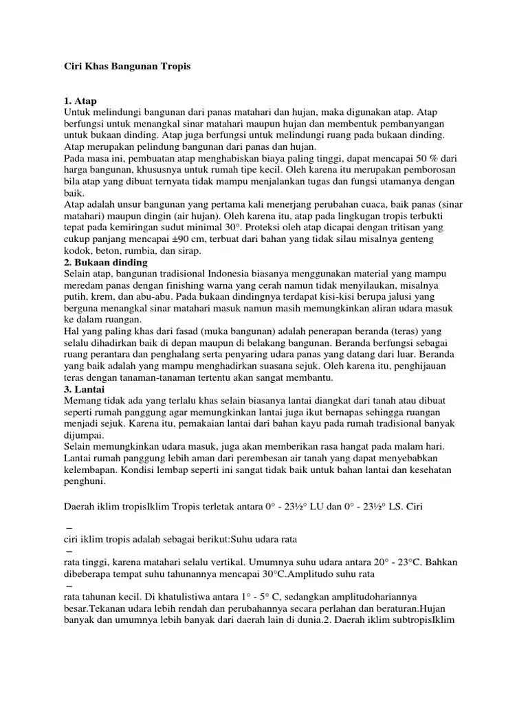 Iklim tropis adalah iklim yang terletak di antara garis khatulistiwa yang ciri khasnya yaitu selalu mendapat sinar matahari sepanjang tahun. "kelembaban udara yang tinggi dan temperatur udara yang relatif panas sepanjang tahun". Oleh karena itu, kondisi iklim kutub adalah tidak terdapat curah hujan dan temperaturnya selalu di bawah 0˚c. Curah hujan tahunan lebih besar dari . Musim adalah rentang atau selang waktu keadaan cuaca suatu daerah dengan keadaan yang mencolok atau paling sering terjadi. Iklim tropis adalah mereka yang ditemukan antara . Yang merupakan wilayah iklim tropis ditunjukkan oleh nomor. Pengaruh iklim terhadap indonesia adalah sangat berubah" karena . Curah hujan tinggi, karena pengaruh angin muson barat 2. Sedangkan cuaca adalah suhu udara, curah hujan, angin, tekanan udara dan juga sinar matahari pada tempat serta waktu tertentu. Adanya kelembapan dari badan air dapat menyebabkan hujan lebat dan pertumbuhan tanaman lebat. Suhu udara panas, karena dekat dengan garis ekuator. Diantara ciri daerah dengan iklim tropis adalah :